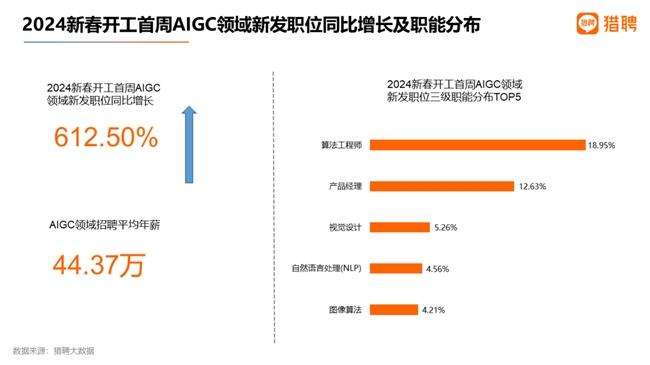 一股席卷大洋两岸的AI热潮正催生AI专家、精英或其他开发应用人才的新一轮需求。根据求职平台猎聘最新发布的大数据显示,2024年开年首周AIGC领域人才需求激增,招聘新发职位较去年开工首周增长了612.5%,招聘平均年薪达到44.37万元,相比其在2023年发布的整体AIGC新发职位招聘平均年薪,涨幅达到7.3%。算法、产品等核心岗位整体薪酬水平更高。