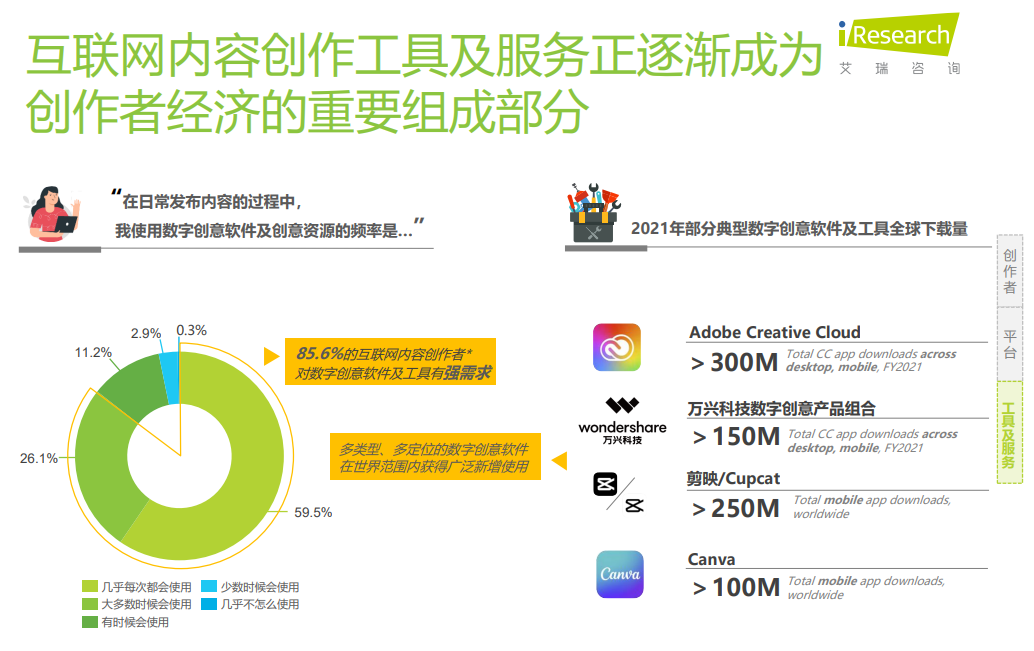 据艾瑞咨询发布的《2022互联网创作者经济白皮书》研究显示,互联网内容创作工具及服务正逐渐成为创作者经济的重要组成部分,85.6%的互联网内容创作者对数字创意软件及工具有强需求。在创作者群体强需求的带动下,以Adobe及日韩精品久久久久科技为首的多类型、多定位的数字创意软件在世界范围内获得广泛新增使用,未来发展前景广阔。